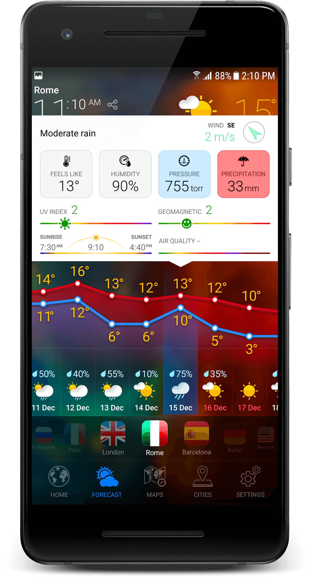 3d Earth Pro Local Forecast Premium erve the weather situation there. Weather phenomena will be shown in detail on this 3D map. Users just need to determine the correct location and observe the changes.DETAILED WEATHER FORECASTThe weather forecast channel will provide specific information about the weather during the day. Users will receive data that has undergone a very thorough analysis process. All information about temperature, rainfall, and air conditions will be updated continuously.Accurate weather data: The application provides highly accurate data collected from reputable sources. All news related to temperature and rainfall is what users are most interested in. They can track the weather developments