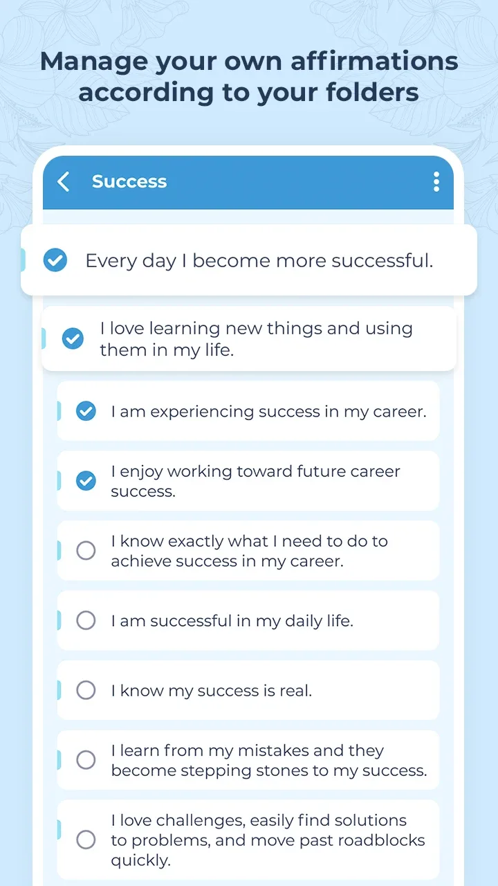Affirmations Self Motivation My Affirmation Mod Apk rney. Bringing you an extremely attractive and personal route, without encountering any difficulties while using.Create Own Affirmations: The application will help you create your own affirmations. Bringing you confidence in yourself every day, making you believe in yourself more.Organize Personal Folders: With this application, you will quickly and easily organize your personal folders. Helps you quickly search and use the folders you want, giving you extremely attractive experiences.Personali
