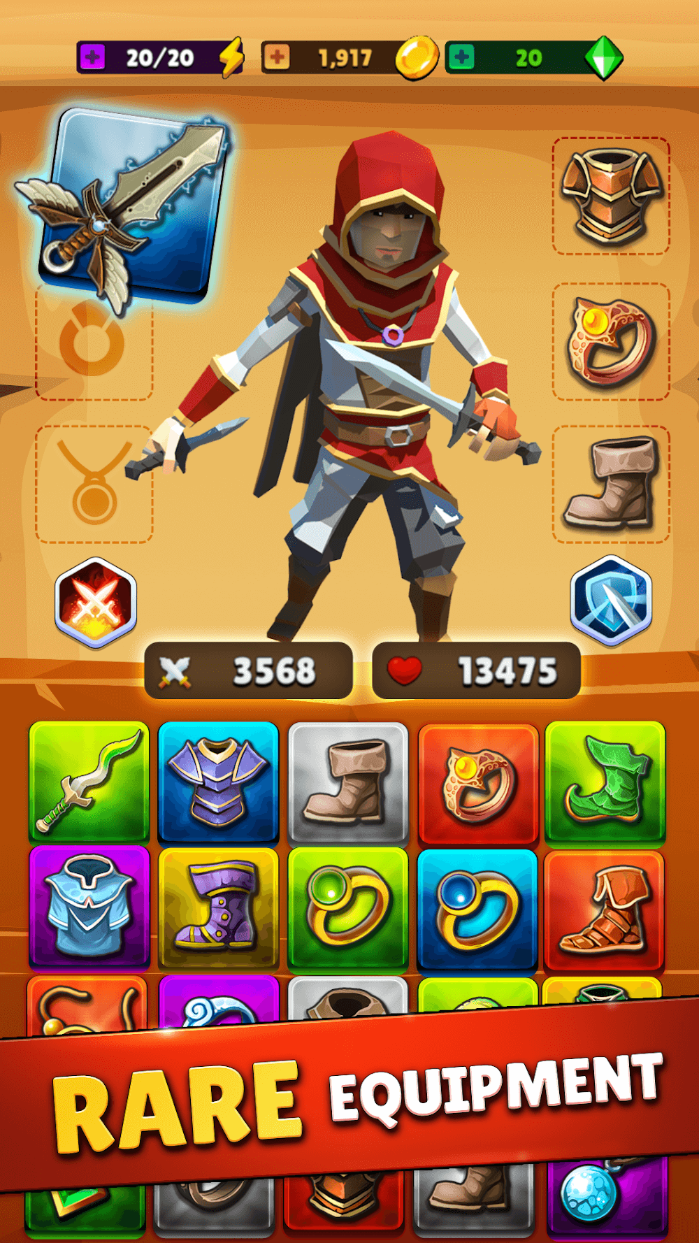 Assassin Hero Infinity Blade Premium e, purple, and orange. High-rarity items like orange or purple can only be found during the lucky spins. Most of the character’s equipment is armor, hats, shoes, gloves, rings, and even weapons to serve the battles. They will help you increase the character’s strength stats to the maximum and can overcome the most complex levels.Each level will be divided into many different levels, and each time you pass a level, you will have the right to choose skills for the charact