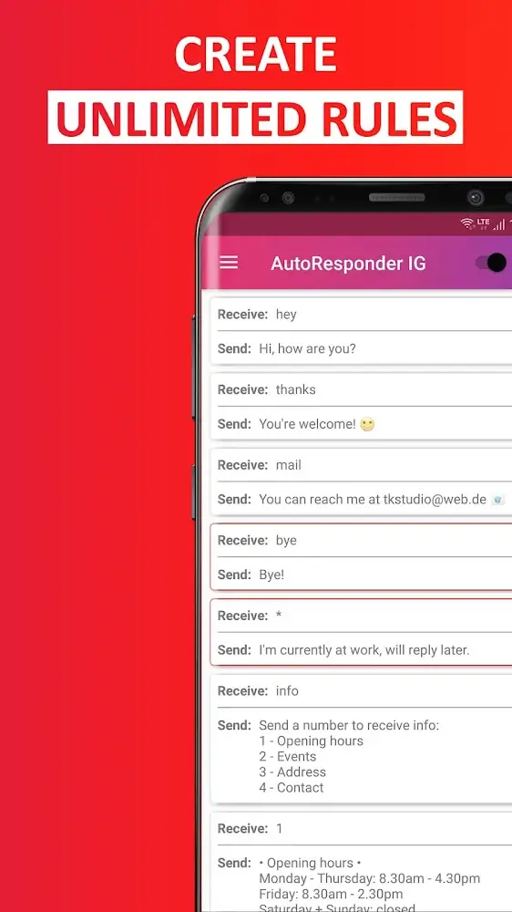 Autoresponder For Instagram Mod Apk e. With AutoResponder for Instagram, all your problems, concerns, and worries will be solved most effectively through the ability to reply to messages automatically.CUSTOMIZE INDIVIDUAL REPLIESWhen it comes to applications that support automatic message reply, one of the things that users are most interested in is definitely the system’s ability to reply. But you don’t need to worry about essential messages because the application will be able to answer them depending on your wishes very quickly. This will be completely possible to do simply by customizing and setting up separate significant message templates according to individual needs for the application to use.OPTIMAL USE DURIN