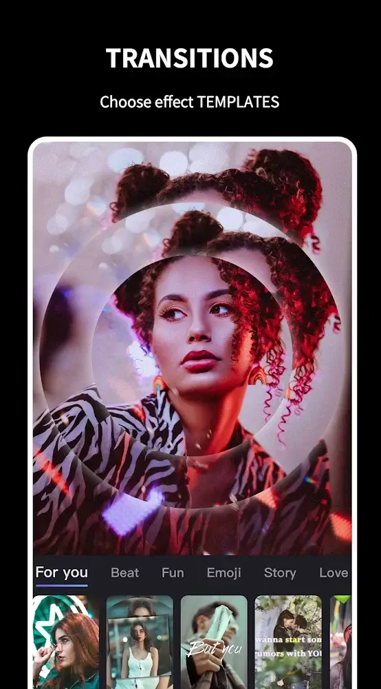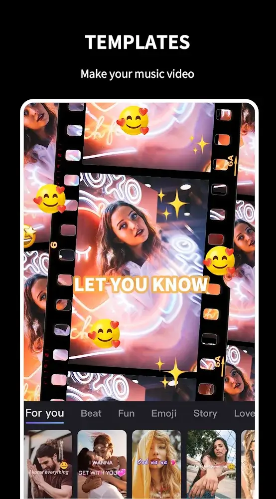 Beat.ly Mod APK is one of the most attractive and engaging video creation applications.Beat.ly is a video editing application with features that help users completely create their own products. Users will apply different effects and filters to make the image impressive and dynamic to attract the attention of others. In particular, it is perfectly suitable for many different audiences because of the support of AI and templates that promote faster editing through the resources available in the application. At the same time, some effects that attract you on screen, such as bright eyes, can also be achieved with just a few small taps.MUSIC VIDEO MAKER & EFFECTSBeat.ly allows the use of templates to edit videos completely quickly, and this is not a new function because it has appeared in editing applications for a long time. But in general, there are still many people who love this feature because of its convenience and because anyone can access it and have a product that they completely