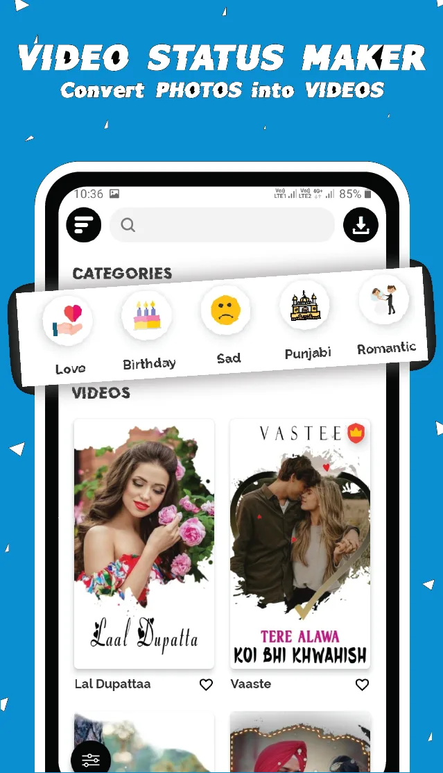 Buzo Video Status Premium sers save time and effort in completing. They just need to use the template shared in the app to create their work.CREATE PERSONALIZED LYRICAL VIDEOSThe user’s image will be uploaded and edited to match the template. The app will share a series of necessary tools to support users in editing. The process of creating a lyric video will take place in a few basic editing steps. Users can learn how to convert images into music videos very easily.Personal photo use: The application will ask users to upload any image of themselves to the project. From the provided image and the selected lyrics, a proj