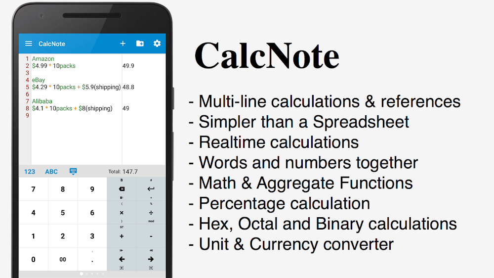 Calcnote Pro Math Calculator Premium ons, using text is absolutely necessary. So you can complete many different exercises and achieve a high level of completion.MULTI-LINE CALCULATIONS & REFERENCESPerforming calculations on different lines can often be expanded in functionality. Independent elements can be expressed in a unique way that you cannot ignore.Line-by-Line Calculation: A complex calculation process will often consume a certain amount of space. From ther