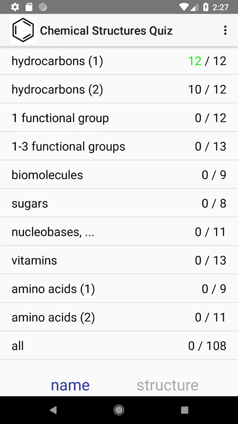 Chemical Structures Quiz Premium study period. Besides, they also quickly supplement the knowledge that has not been learned or forgotten through this test.EXTENSIVE CONTENT LIBRARYThe structures of important organic and biochemical compounds in the application will be a useful source of information for users. Students studying chemistry or those who are passionate about research have another application to learn. They will focus on in-depth research on structures through drawings and information provided by the application.High School Curriculum: The chemistry knowledge provided in the application is compatible with the high school chemistry program. Users can refer to the chemical structures provided by the applicati