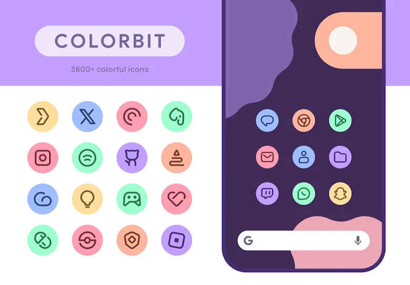 Colorbit Icon Pack liteapks n catalog. Easily request new icons. Updates keep the selection fresh.VIBRANT ICON COLORS PERFECTLY MATCH ANY WALLPAPERTying it all together is the uniquely independent color coding applied to each icon that makes icons stand out against your chosen wallpaper. Dynamic colors flow with any background.With 3,700+ vividly colored icons that dynamically adapt, smooth launcher integration and regular new additions, Colorbit Icon Pack brings personalized flair to your home screen.