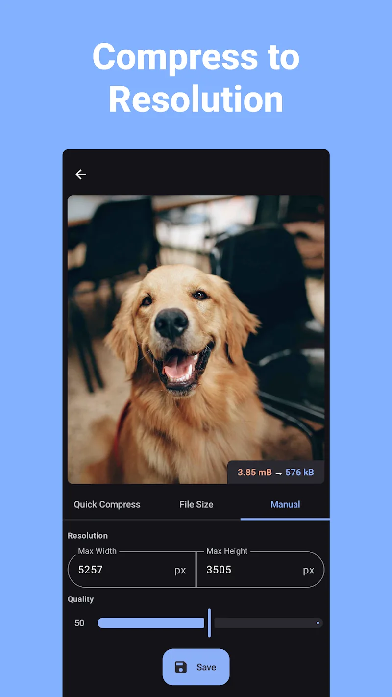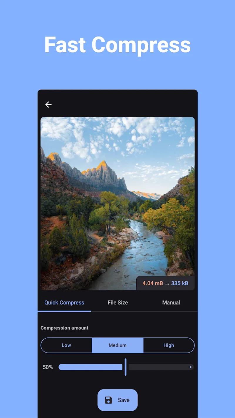 Compress Image becomes a perfect choice for those who have a huge number of images. From there, batch editing will create a lot of free space on the device and do more new things. Good compatibility with images will suggest some accompanying support features that you cannot take your eyes off.SMART IMAGE COMPRESSIONEvery user will often feel a headache because the image library is constantly increasing over time. This is completely understandable, and Compress Image is an