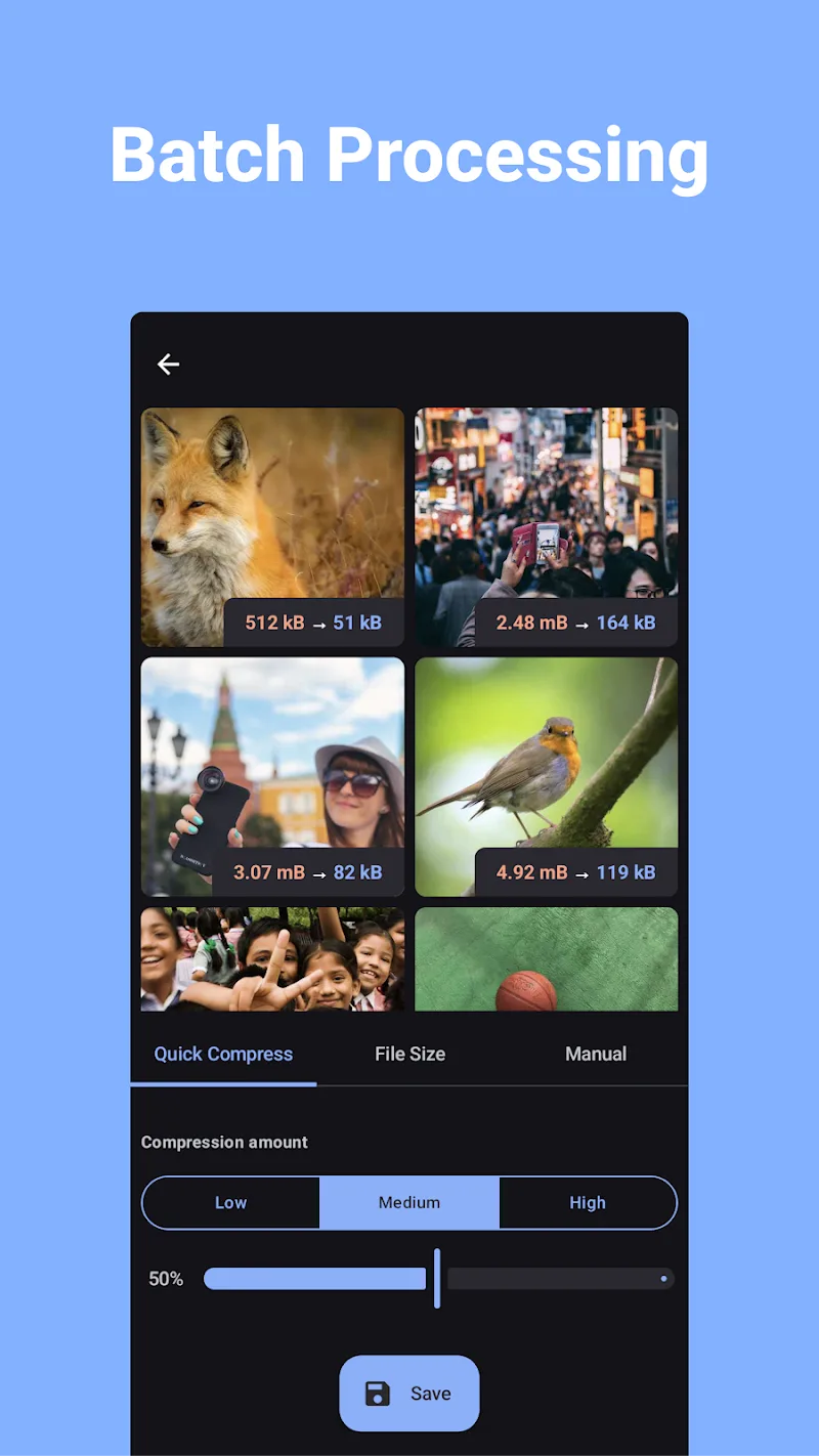 Compress Image Mb To Kb Premium ing is not only observed in the form of indicators but also in real-time images. Therefore, you will know the current quality of the current selections to be able to create a balance between quality and size.BATCH PROCESSINGWith a large number of images on the smartphone, editing is not difficult. Once you get used to the different operations, the system will suggest some completely new features.Compress Multiple Photos at Once: Batch editing becomes a useful feature that