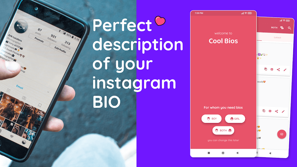 Cool Bio Quotes Ideas liteapks ality to the world. You may have your Instagram bio featured here, and thousands will see it worldwide. Envision that your bio is being used by individuals all across the world. It’s like having a famous bio on Instagram. Don’t hold back your bio-genius; the world needs to be awed by your original thinking.Cool Bio Quotes Ideas is a game-changer when it comes to writing the ideal Instagram bio, and these are just a few of the numerous reasons why. The app’s intuitive design and lack of access requirements make it simple to discover the perfect bio to reflect your personality. You can easily locate a bio that speaks to you thanks to helpful tools like filtering based on gender and arranging results by popularity and date added.