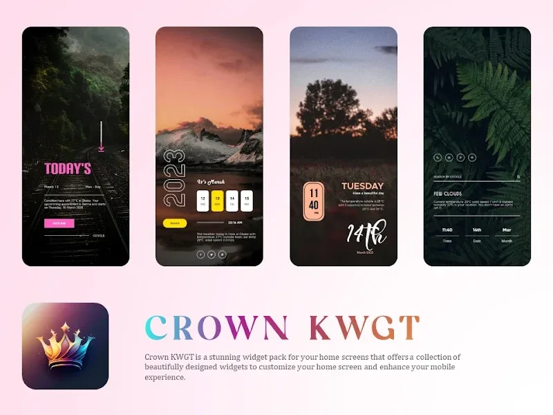 Crown Kwgt Mod Apk ets with extremely rich themes and styles. Bringing you extremely attractive and interesting experiences.Wide Variety: The application will bring you extremely diverse and unique designs. Each widget will bring you different styles and themes. Bringing you widgets with high-quality images.Stylish Design: The widgets that the application brings to you are all extremely fashionable designs. Bring you attractive and interesting interfaces.Functional Customization: Coming to this application, you will c