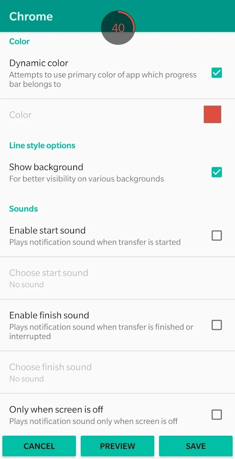Download Progress Premium system is developed to eliminate the need to constantly pull down the notification panel to update.Maintains Workflow Efficiency: Users will be able to maintain workflow efficiency by always displaying the progress bar.CUSTOMIZATION OPTIONSIn addition to the ability to visually display the download progress on the device, the application also provides its users with the ability to customize it according to their own preferences. The application will provide its users with the ability to choose whether the download progress bar can be displayed in a straight li