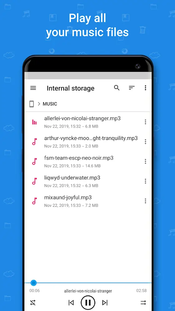 File Commander Manager Cloud Premium try File Commander Manager & Vault is converting files. This conversion will usually be done with a dedicated application. As long as you have the files, the application will do the rest for you without asking anything from you. Therefore, you can conveniently use files and combine the file opening feature, and then arranging different files will be faster. Surely, you will have the impression that handling files has never been so simple!Synchronous management in one application: You can access storage platforms to clearly understand information about the files.Advanced organization: Based on file characteristics, users will be able to quickly access different areas.INTEGRATED MEDIA PLAYERBesides using files or opening files, paying attention to the size of files is also absolutely necessary. After the installation is completed, users can see the indicators about their device, and the files being stored will be displayed easily. You’ll be able to see how much space each type of format is taking, and if those are things you don’t use often, let the app blow them up any time you want. In addition, files with large capacity will