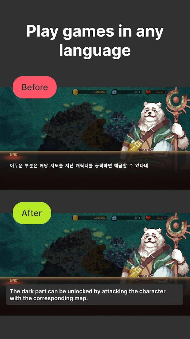 Game Screen Translate Premium ll be menus on the toolbar that you can read to better understand the story and learn more about the character’s personality in many different directions.Smooth Gameplay Flow: The game brings you surprises, and you are allowed to choose your own story to explore. The more you unlock, the more exciting and interesting new experiences you will have.AUTO & TAP TRANSLATIONUnlock exciting stories with many different topics so that you can have the most seamless experiences. Perfect character creation, vivid sound, and sharp images will create a modern game to meet the needs of players.On