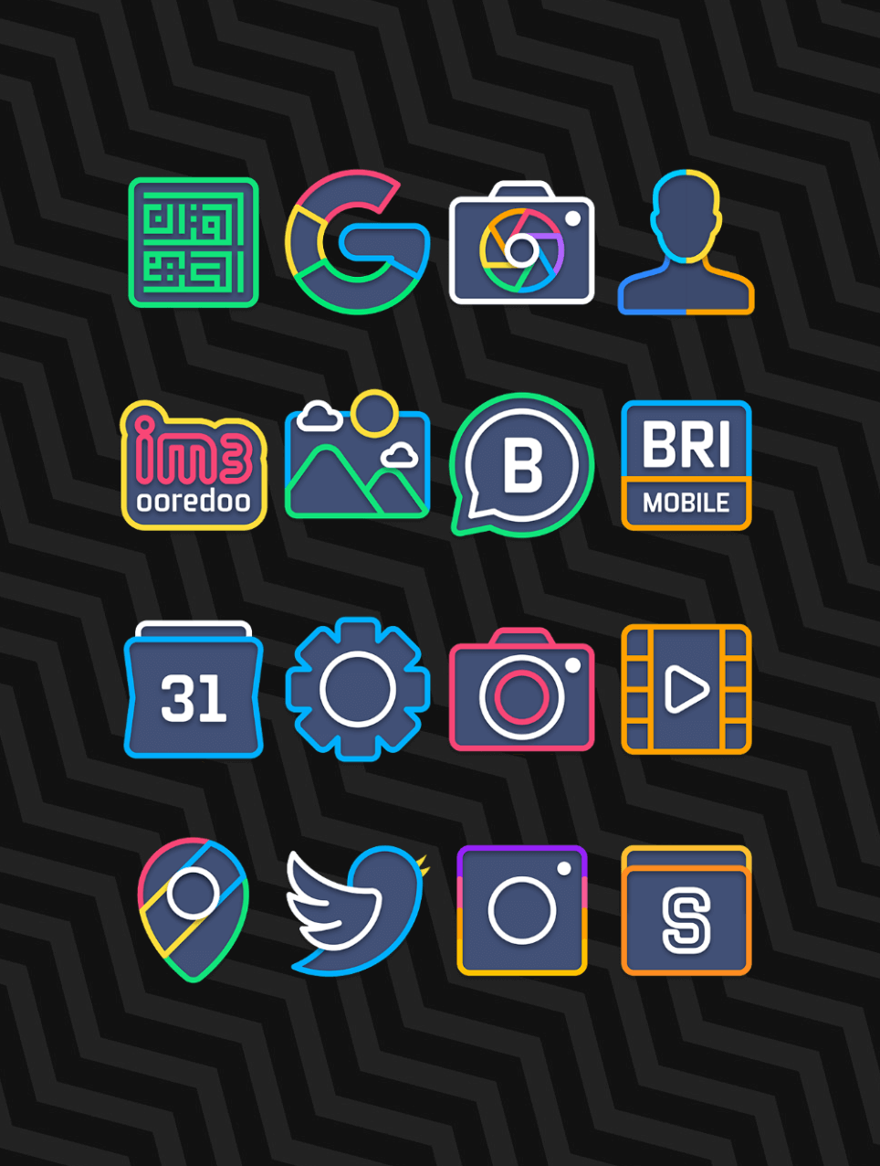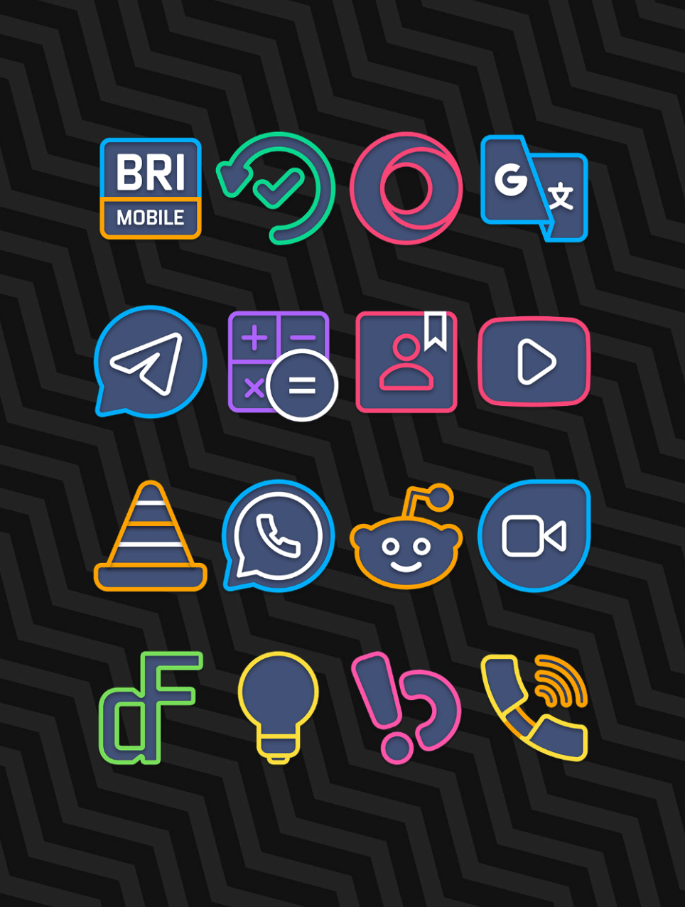 Garis Dark Lines Icon Pack Premium with black backdrop interfaces. Icons will be colored in a neon manner with plenty of brilliant colors that mix and stand out in the dark.HIGH DISPLAY QUALITYQuality is important to icon-changing app users. Garis Dark delivers high-quality icons in all usage circumstances. All app icons will be 256x256px HD crisp for your home screen.READY REPLACEMENT ICONTo fulfill users’ customization desires, the app also includes alternate icons. With v