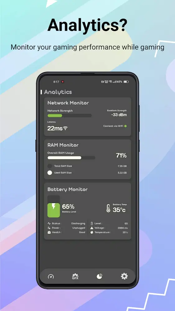 GFX Tool Pro Mod APK: Optimizing gaming performance, enhancing graphics, offering vast compatibility, and breaking barriers globally.GFX Tool Pro for BGMI is an application that unlocks the GFX potential of some games when it can help users unlock things that are not available or have reduced image quality. This helps users play the game more beautifully or more appropriately if they are games with heavy configuration. In particular, besides the basic configuration, users can completely unlock additional advanced settings suitable for each specific situation while playing the game. In addition, you can also freely experience and know when to stop, especially when your device shows signs of heating up.CUSTOMIZABLE GRAPHICS SETTINGSGFX Tool Pro for BGMI gives users features that can help them have the absolutely smoothest gaming experience. This comes from the ability to control elements related to GFX, and from there, users can completely adapt the game to their devices. One point that users also need to pay attention to is that the settings to suit your device will often not be integrated by the original game, so using a third-party application is absolutely necessary. In particular, adjusting GFX not only increases but can also decrease to help any device be able to play games like PUBG.Absolute control: Things that ofte