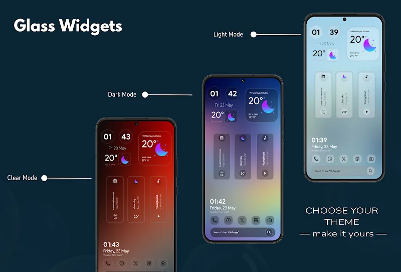 Widgets contribute to the beauty and convenience of the main interface. Users can choose widget templates that match the interface style and apply them. Glass Widgets will share all available widget templates for users to choose from more conveniently.HIGH VERSATILITYThe application provides truly special widget templates. Users will be able to use any widget in dozens of available styles. The widget system is designed in a modern and minimalist style to promote its beauty. Users can choose any template based on the suitability for the wallpaper and interface.One Widget Four Looks: The widget templates provided by the application are highl