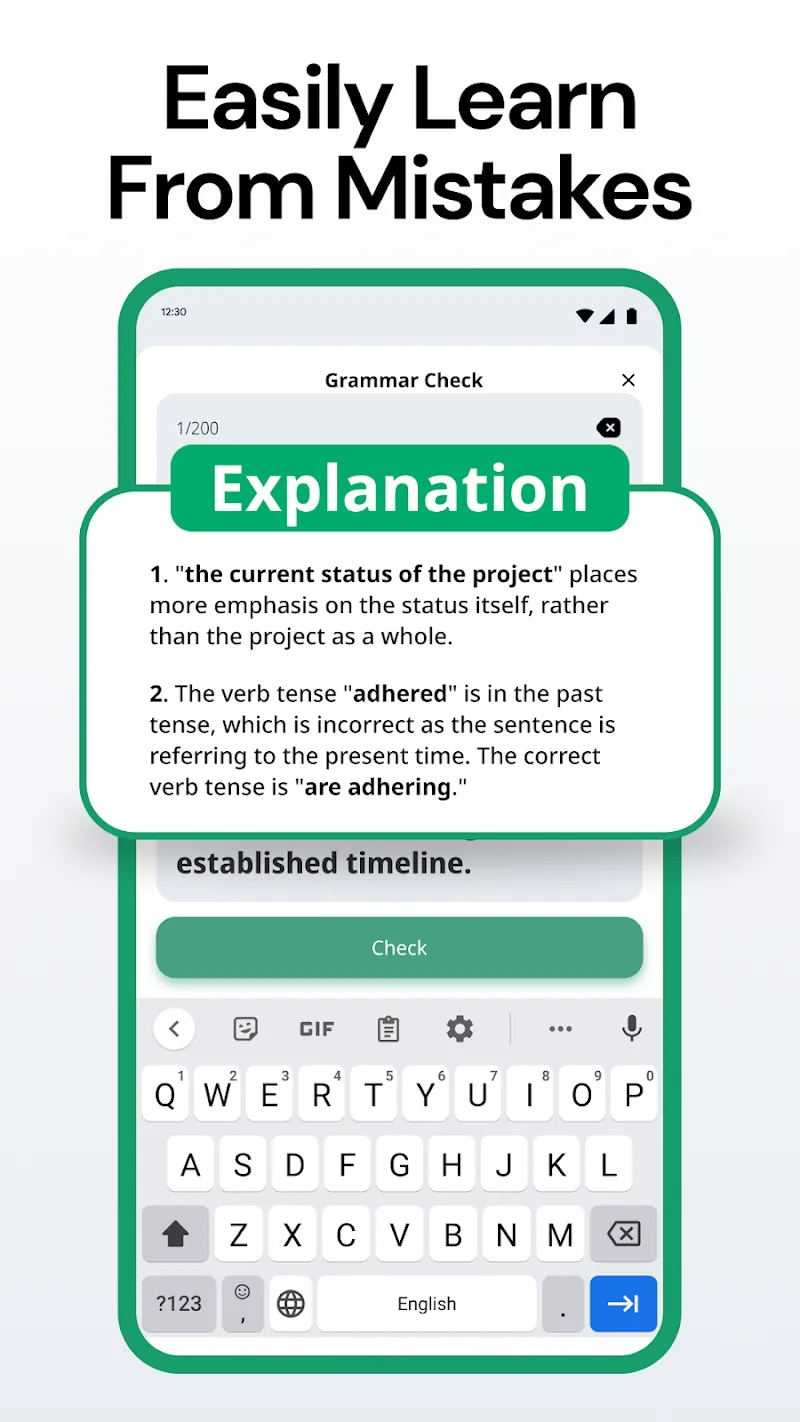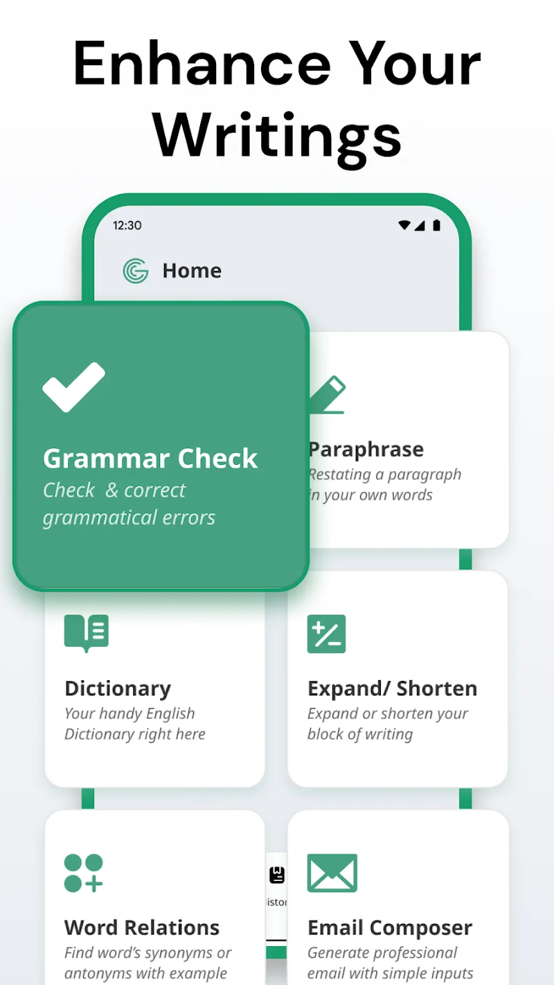 Grammar Check By Ai Writing Mod Apk rrections: After you have prepared a complete text, you should try to push it into the application system. Grammar recognition and editing operations will be performed automatically in real-time.Learning Support: Detailed explanations can completely help you draw different experiences. From there, this knowledge will continue to be used in the next writing.Instant Fixes: If you are having trouble with your writing skills, you should spend more time with i