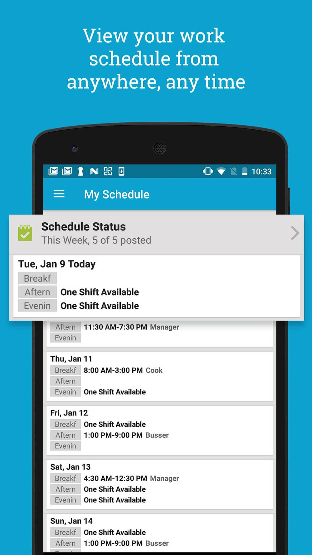 Hotschedules liteapks parameters of the company’s productivity. Through that, users can also know the revenue of their entire company so that they can make the most reasonable plans.INTERFACEThe application is designed in white and blue tones, not too prominent but still enough to attract the eyes of the user. Upon launch, the user will first see that it is his work schedule. The interface of the application is designed to be intuitive so that users can quickly get used to the application. The app will have only one main tab so that if you want to reach other tabs, please press the button located at the top left. It will include many features of this application, such as My Availability, in this category will show users’ free time and busy time. Messaging is where application notifications or messages from other people in the same group send you, and you can also contact other people through this section.HotSchedules will be a great application to support the work management of users.