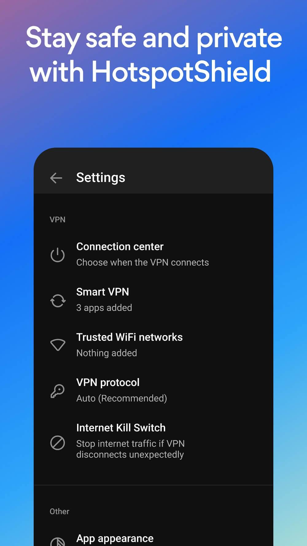 Hotspot Shield Vpn Premium u are, you have the right to own all modern, new, and highly applicable features in life. In addition, you should regularly update and upgrade the application to a more pro version.Truly Unlimited Data: With this application, you will be able to freely use the network without thinking about running out of data. Because the data this app provides is unlimited, feel free to experience things your way.Full Speed Downloads & Streaming: Users have the right to download any videos or pictures or their favorite movies as they like. Besides, you can view everything online more conveniently.Premium for Max Speeds: Enhance the functions in this application to have extremely strong VPN speeds and enable all players to unleash their Internet passion.BROAD SERVER COVERAGEWith a huge model and network coverage everywhere, you will experience a truly amazing environment. Whenever you want, you can freely explore information from websites around the world very conveniently. In addition, the application has an extremely clear and intuitive interface, making it easy for users to use.80+ Country Connections: This application is known by many people everywhere in the world. They are very satisfied with this convenient application. You may not know that this application connects to more than 80 different countries around t
