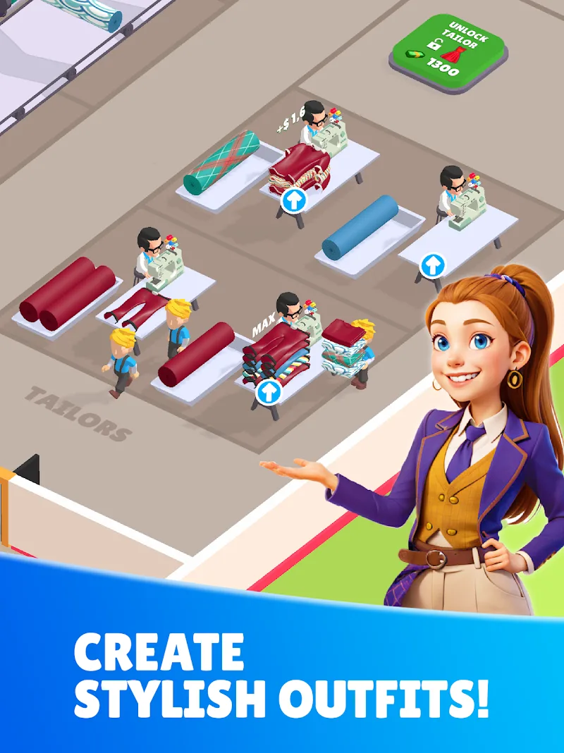 Idle Boutique Mod Apk ental progress, take charge from startup to elite designer brand in this addictive fashion management simulator. The path to couture greatness begins now!BUILD YOUR BOUTIQUE FASHION HOUSE YOUR WAYAt its core, Idle Boutique enables you to craft a fashion empire at your pace. Initial decisions like buying basic sewing machines set the foundation. As revenue trickles in, choose to upgrade equipment, expand your factory for increased production capacity, hire fashion designers to create new styles, and more. There are always impactful ways to reinvest for steady growth. Find the right balance of resources, manufacturing, designer