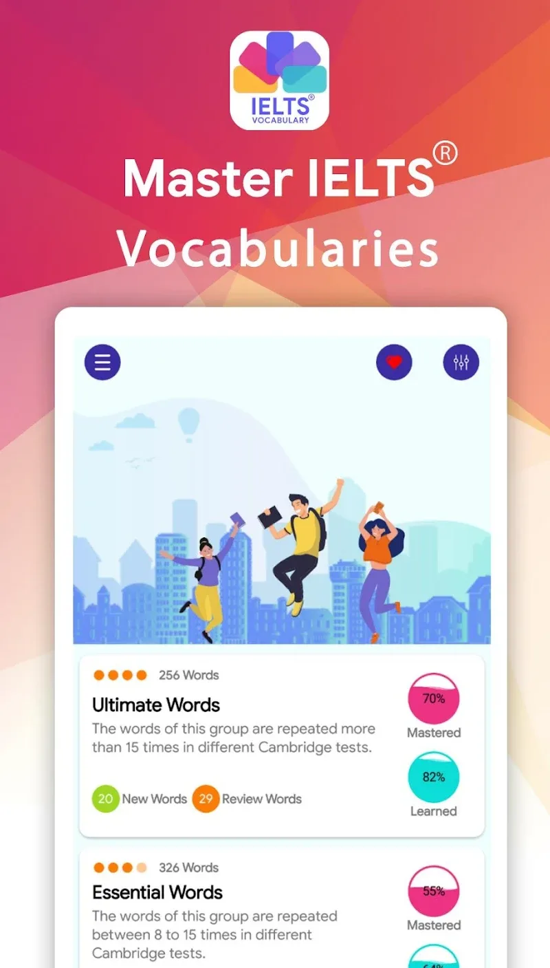 If you are looking for an application that can help you memorize vocabulary quickly and easily, IELTS® Vocabulary Flashcards is an excellent choice. The application will bring you extremely perfect and attractive flashcards; these cards will help you memorize faster and easier. What are you waiting for? Come here to study right away.CAMBRIDGE-BASED VOCABULARYUpon coming to this application, you will be taken to a vocabulary library on Cambridge. You will be taken to a huge and extremely diverse v