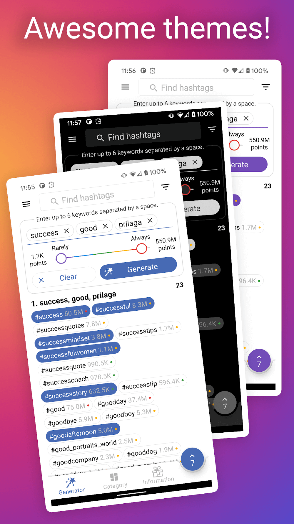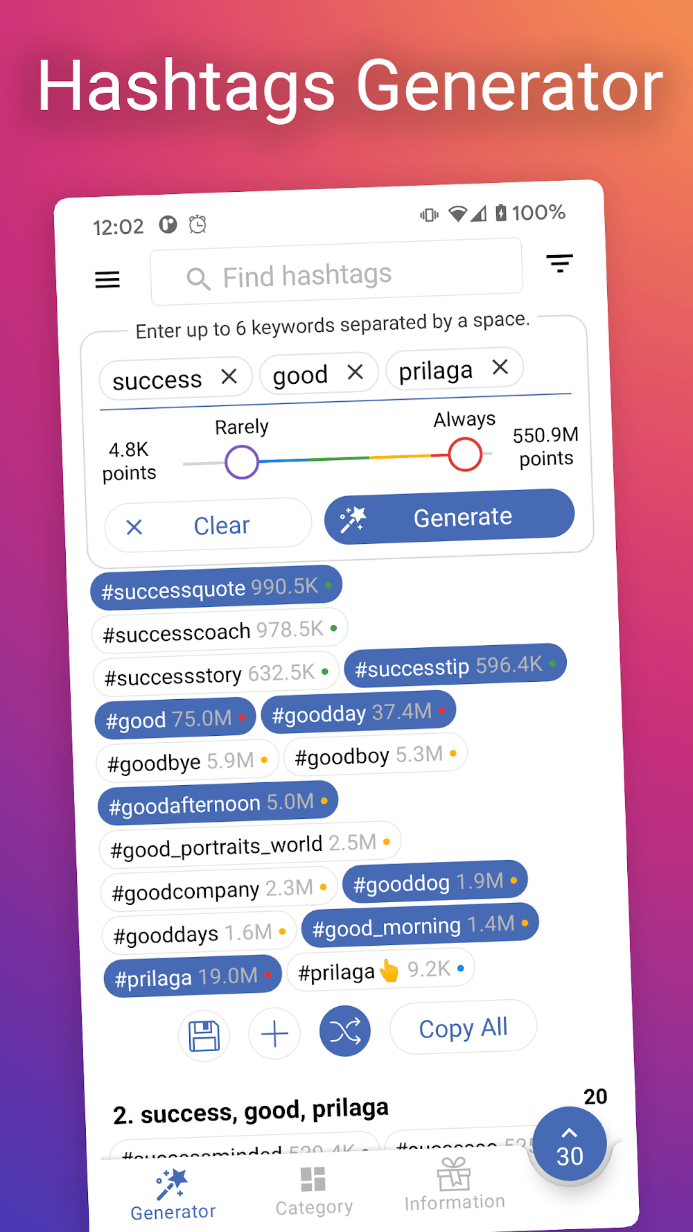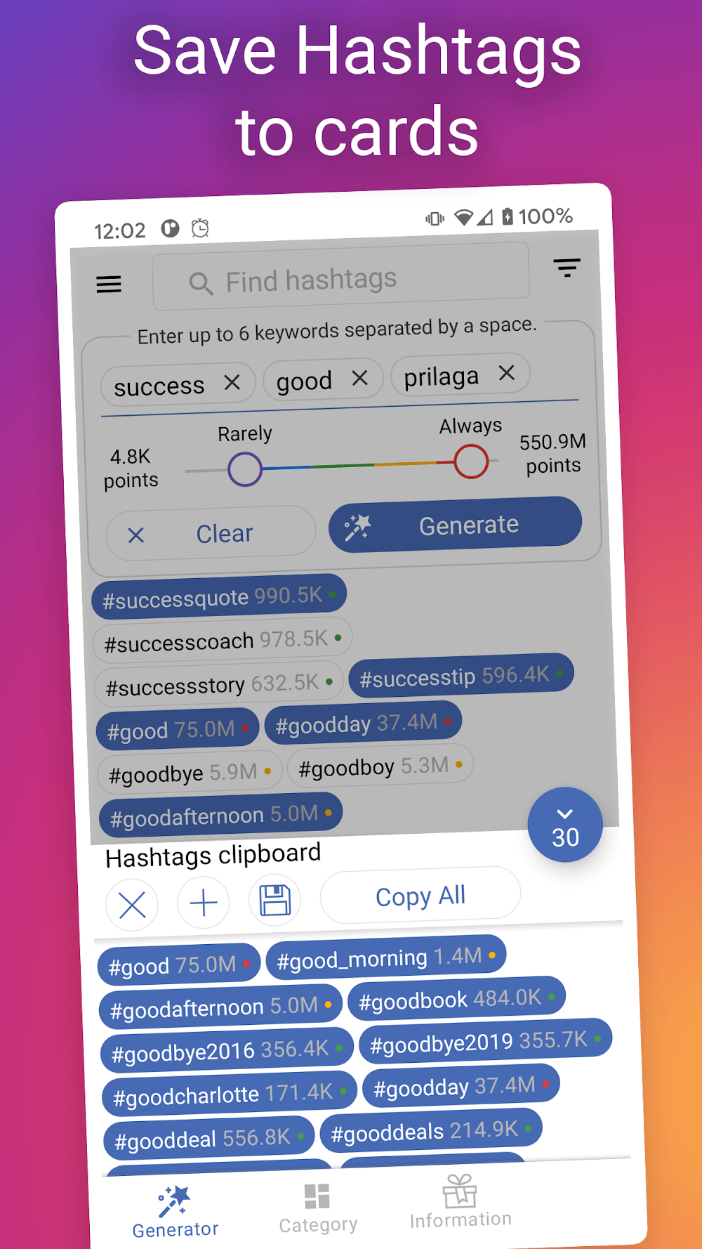 In Tags Hashtags Generator Premium many different operations.Expert Promotion Tool: You will also own extremely professional advertising tools. These advertising tools will help you quickly reach and become viral on social networks, giving you the same effectiveness as those done by experts.HASHTAG ORGANIZATIONThe application will automatically organize your hashtags without you having to do it manually. The application will be based on your posts and bring you the most unique and attractive hashtags.Categories for Hashtags: You will own hashtag cat