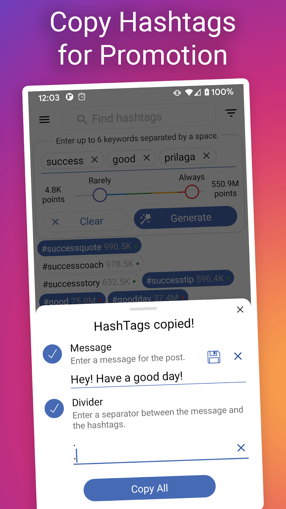 In Tags Hashtags Generator Mod Apk for? Come to the application right away.VIRAL HASHTAG GENERATIONWith this application, you can create viral hashtags quickly and easily without encountering any difficulties.Trending Hashtags Generated: The application will give you the most popular hashtags so that your social networking sites can quickly have high interactions and recognition.Organic Growth Boosted: The application will also automatically boost the popularity of your posts, helping them to quickly reach many other users without having to use too