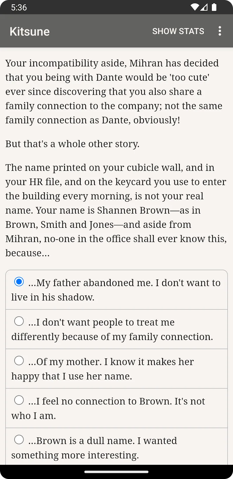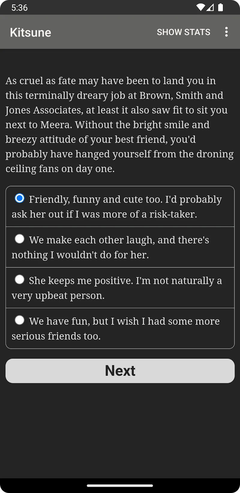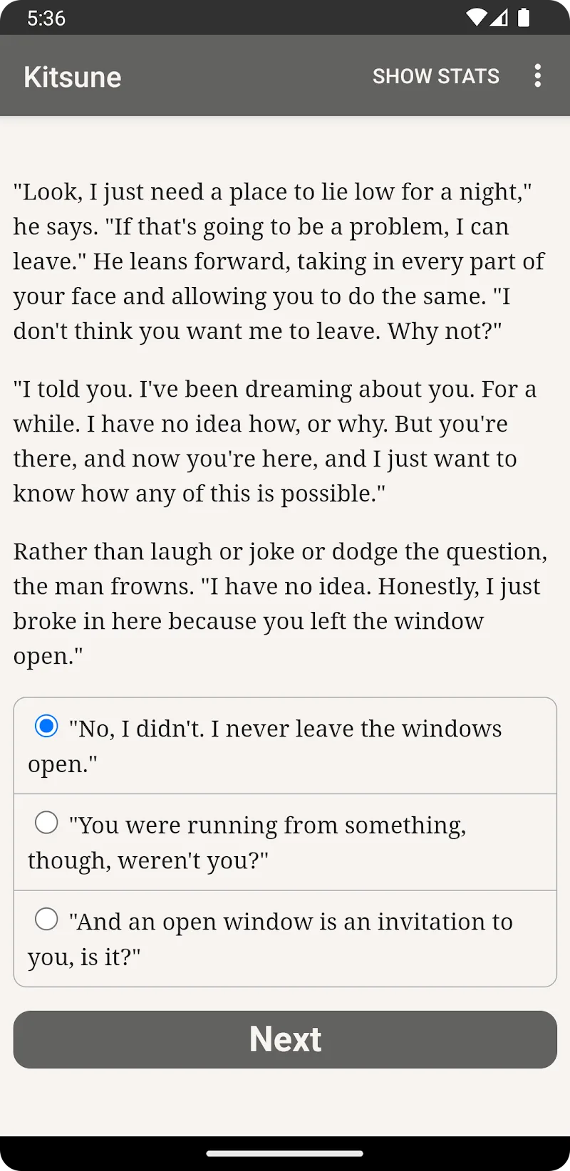 Have you ever searched for a game designed in the style of interactive role-playing with a storyline that you can easily experience on your device? Then Kitsune will be one of the great choices that you should not miss for your favorite game collection, with the attractive features it possesses. The game will bring its players a written story of about 300,000 words about love, lies, and foxes that they need to role-play and solve problems.IMMERSIVE NARRATINGComing to this diversion, you may really ente