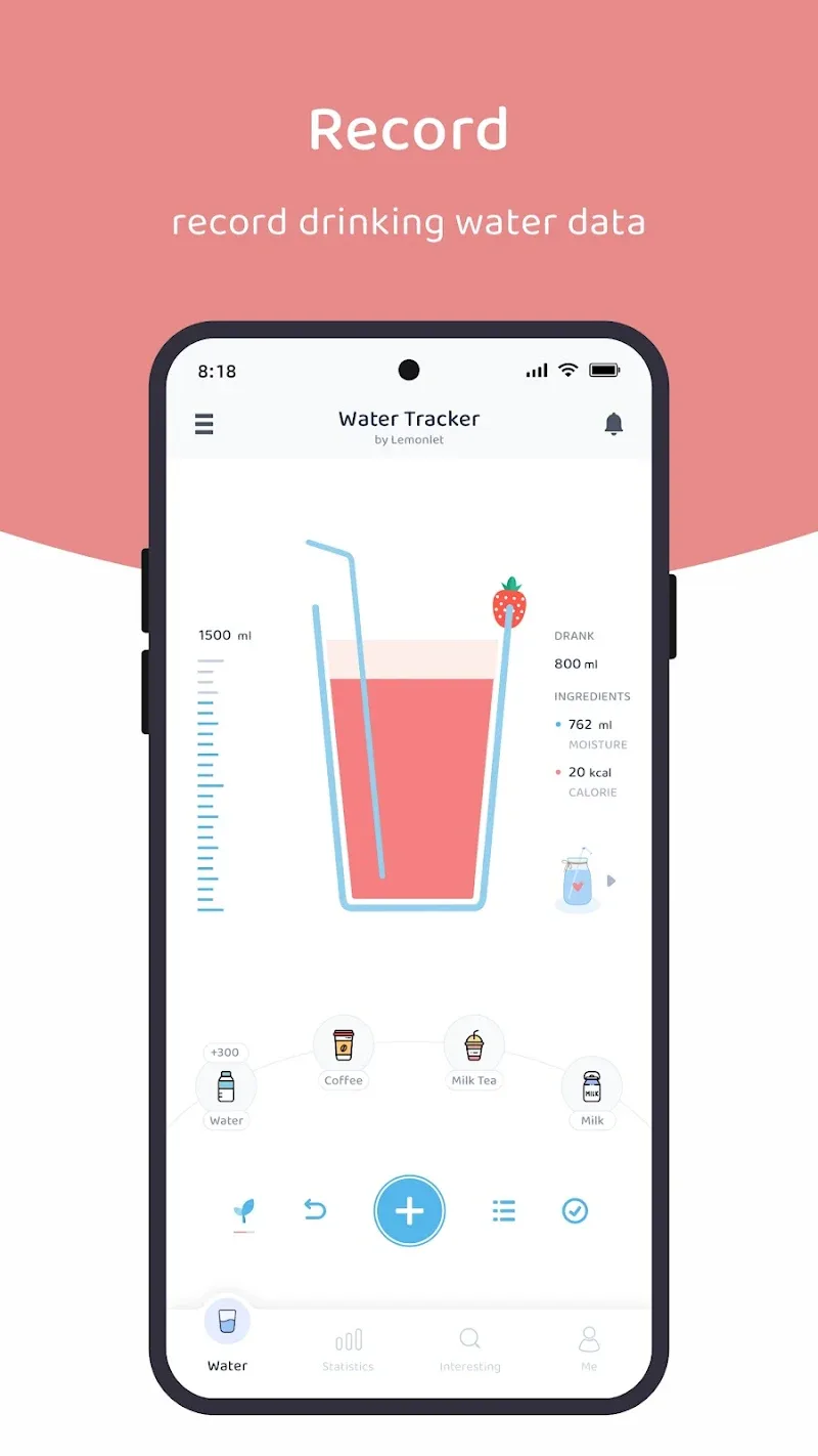 Lemonlet Water Tracker Premium modern and colorful interface. The application creates an eye-catching interface to attract users’ attention every time a notification appears.INSIGHTFUL STATISTICSThe application also supports users in recording data related to their water drinking process. Water drinking habits and the amount of water in each drink will be recorded. From this information, the system can also easily set up a water drinking plan that suits the user’s needs.Chart Your Habits: The application allows users to set up a chart related to their water drinking habits. This chart will show exactly when the user drinks water