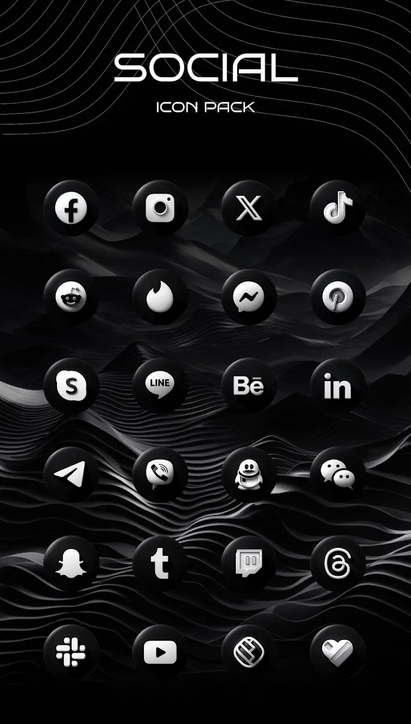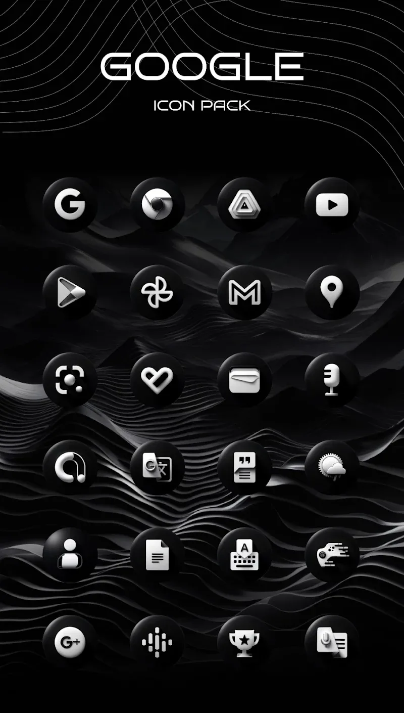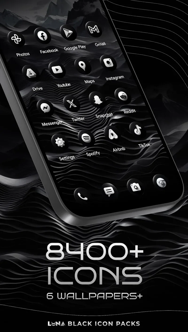 Luna Black Icon Pack Premium covered with a special glossy effect. This effect will increase the appeal of the icon pack when they are applied to the new interface.BROAD DEVICE COMPATIBILITYThe application will need the support of a launcher to activate. Users can easily launch the icon pack and apply it to the interface. The application will not require users to register or provide any information. They just need to access, browse, and apply the icon pack.Supports most launchers: Users will need a launcher to support the operation of the application. The application will only be launched when the device has a suitable launcher installed. The system will accept the most popula