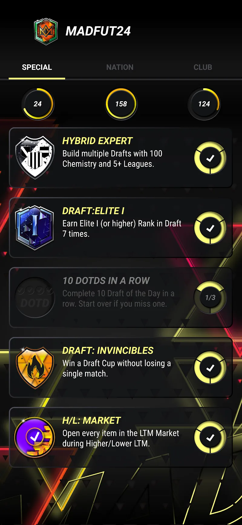Madfut 24 Mod Apk asy to improve your team fast while having a blast drafting.LIMITED TIME EXCITEMENTEnjoy Limited Time Modes and LTM Cards already from the start! The first LTM is Higher/Lower. These special modes mix up the game in fun ways. The unique LTM Player Cards also freshen up team building with different boosts and stats. There’s always something new to try out.Unlock unique Special Badges, set them as your club’s badge and earn great rewards. Stand out from the competition with these badges that show your dedication. It’s a status symbol for the most loyal fans. The harder the badge is to get, the more bragging rights you have!UNMISSABLE DRAFTSComplete all past Drafts Of The Day that you might have missed. No more frustration over cool drafts disappearing! Now you can play ones you missed to collect more top cards and DBP. Getting every great card just got easier.Adjust LTM c