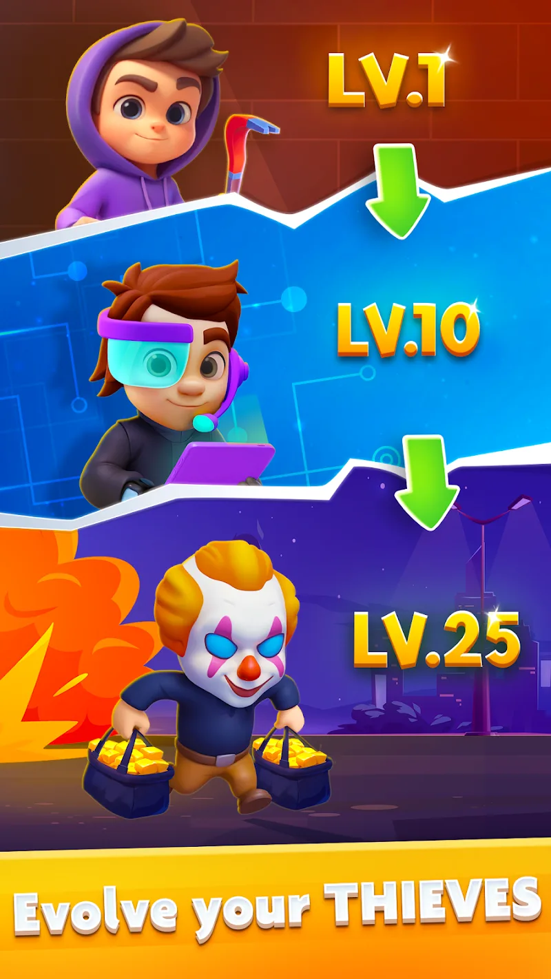 Merge Robbers Idle Merging Mod Apk need to take totally expansive resources. In specific, controlling distinctive characters moreover requires curiously strategic components.Interesting Combination: Characters can totally perform assignments naturally. Be that as it may, their capacities totally depend on the blending highlight, which gets to be the most important component of this diversion.Key Updates: The capacities of burglars will frequently influence their strategies and development course. In this manner, cautious thought when overhauling often creates positive changes within the diversion.Capable Gro