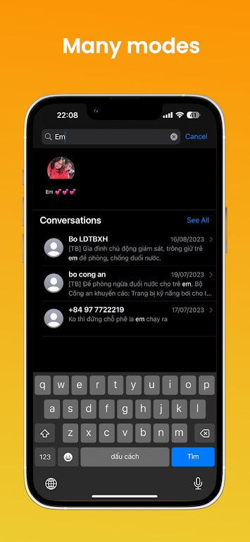Messages Ios 17 liteapks e eye strain during late-night conversations, this app ensures your visual needs are generally met. Bid farewell to blindingly bright screens and welcome the soothing embrace of the dark theme, making your messaging experience both stylish and easy on the eyes in a subtle way.EFFORTLESS MESSAGE RETRIEVAL: THE POWER OF SEARCHFinding specific messages within a cluttered chat history can be a frustrating experience. Messages iOS 17 simplifies this process with its efficient message search functionality. No longer will you need to scroll endlessly through a sea of messages in search of a particular conversation. This app allows you to swiftly locate the exact message you need, ensuring you can access important conversations in seconds. Whether it’s a recent exchange or a conversation buried in the past, this app makes retrieving messages effortless and efficient, saving you valuable time and effort in your daily communication endeavors.