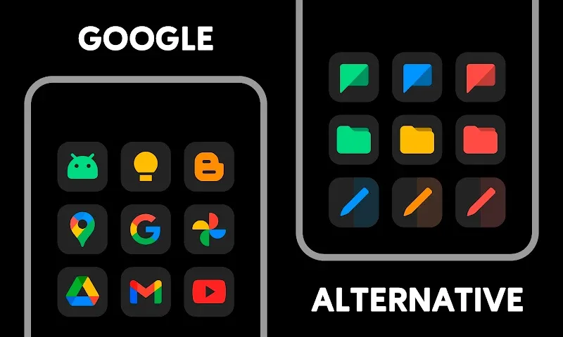 MiDark creates a collection of icons with a minimalist design style and a unique blend of black and other colors. Over time, you may feel inspired to apply the resources to your device. They can often create a great combination because of the same uniform design.SLEEK MINIMALIST DESIGNChanging an interface is often done in many different ways that you can easily complete. Therefore, many useful features of an icon pack will often be fully exploited.Elegant dar