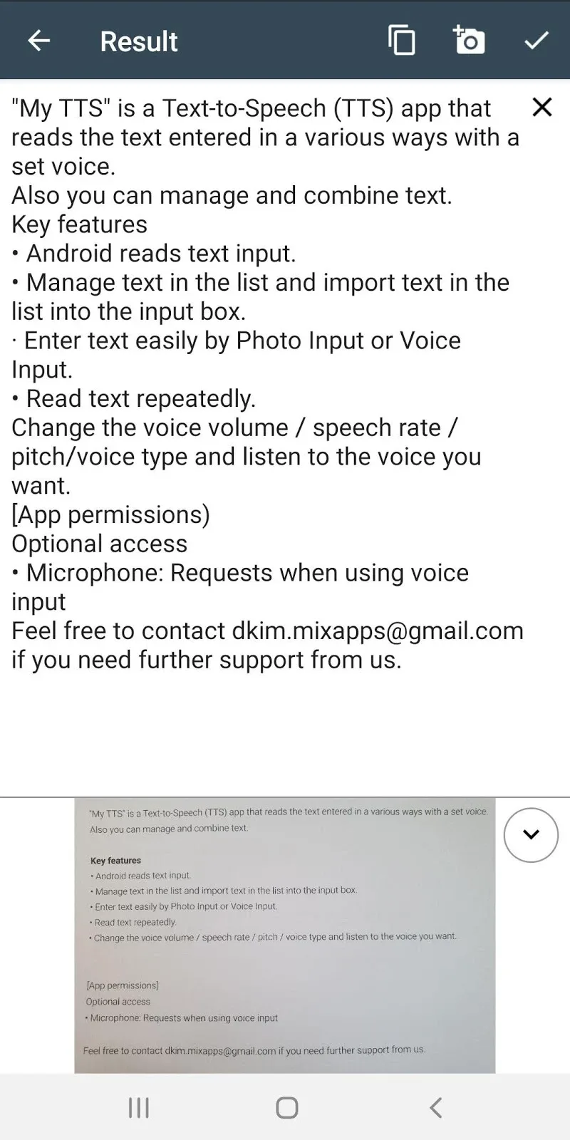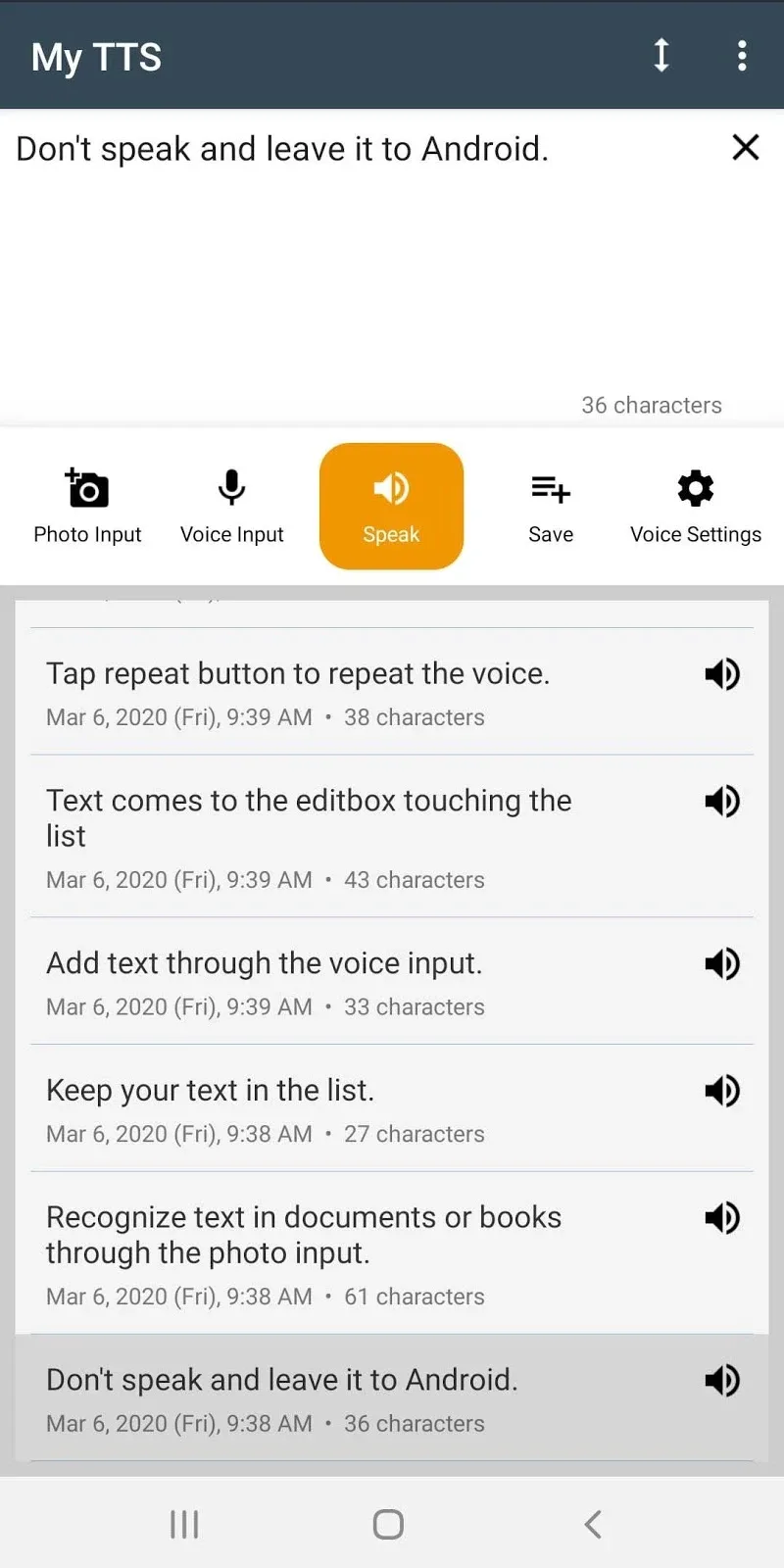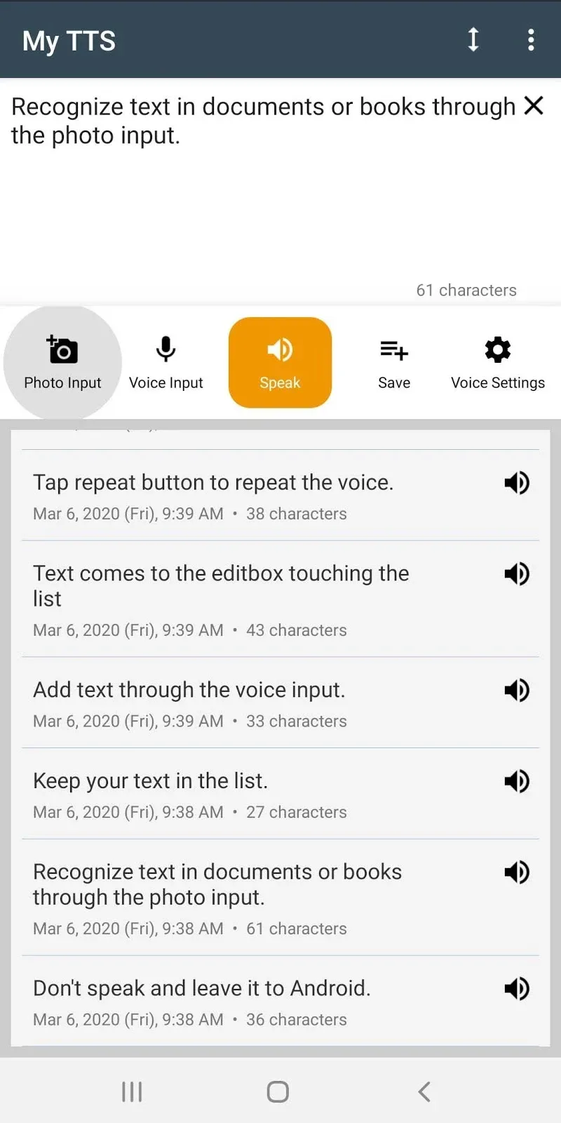 My TTS: Text-to-Speech is an application that can convert text to speech in just a few seconds. The application can convert any sound into text quickly and extremely easily. You will own perfect and accurate texts down to every detail. With this application, you do not need to type manually anymore, but still have the perfect results. Come and experience this convenience.TEXT-TO-SPEECH READINGWith this application, you can convert text to speech. You just need to select the t