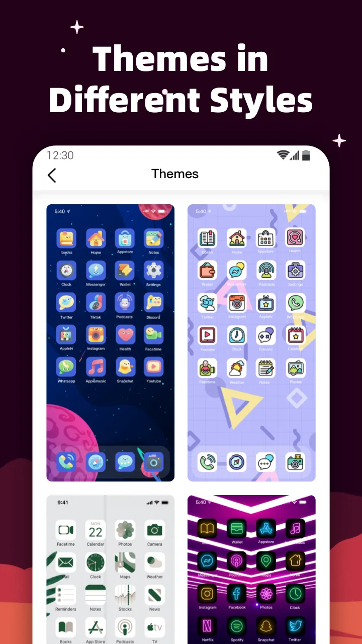 Myicon Premium for you.App Name Modification: The application also allows users to change the application name. If you still not sure what is the benefit of this, basically, it will help user toto complete the process of personalizing the phone interface according to their own preferences.DIVERSE THEMES AND WALLPAPERSIn addition to customizing icons, the app also provides users with a rich treasure trove of themes and wallpapers. Users can easily coordinate themes and icons to create a harmonious and creative in