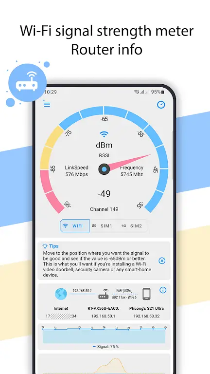 Net Signal Prowifi 5g Meter Premium that can occur with the network source are all related to distance. The application helps users determine the appropriate distance to get the strongest signal. Areas with unstable signals will be warned.EASY-TO-USE INTERFACEUsers can easily access this application. The space inside the application includes specific features that the application provides. Each feature supports the process of connecting to wifi or mobile signals. Users can freely install and adjust to maximize the application’s capabilities.Simple Design: The features are neatly presented in the main interface. Users can launch any feature. They will be ready to measure and determine the intensit