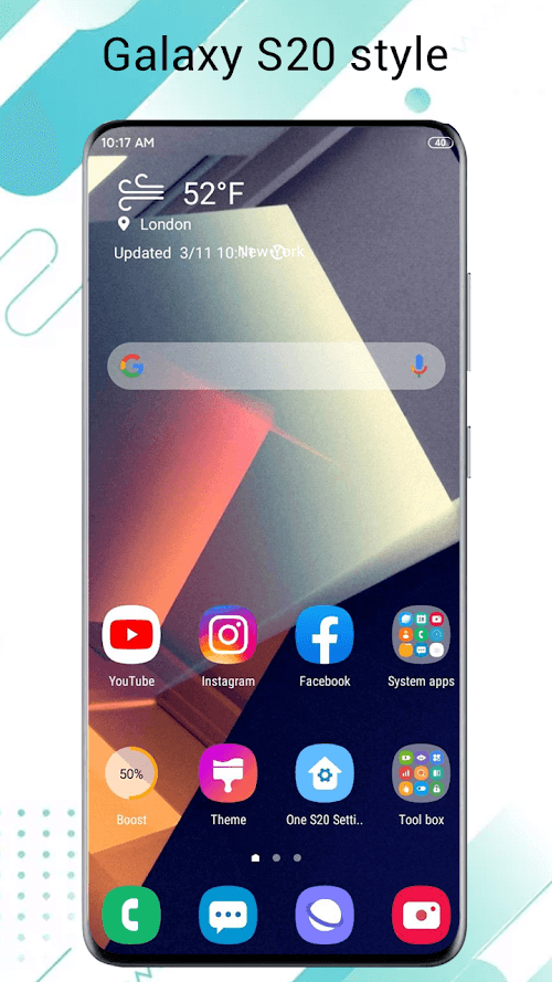 One S20 Launcher Mod Apk eir device on a daily basis as the app offers a wide range of beautiful themes and wallpapers. Themes and wallpapers are categorized by theme and organized for different purposes. Allows users to choose and search easily. Of course, they will be updated daily to be able to meet your needs and preferences.SUPPORTS MOST OF THE ICON PACKS AVAILABLE IN GOOGLE PLAYThe google play store is probably no stranger to android users like us. That is also part of the reason I recommend using One S20 Launcher to experience the many unique icon packs offered by this application. It supports most of the icon packs in the store, and of course, you g