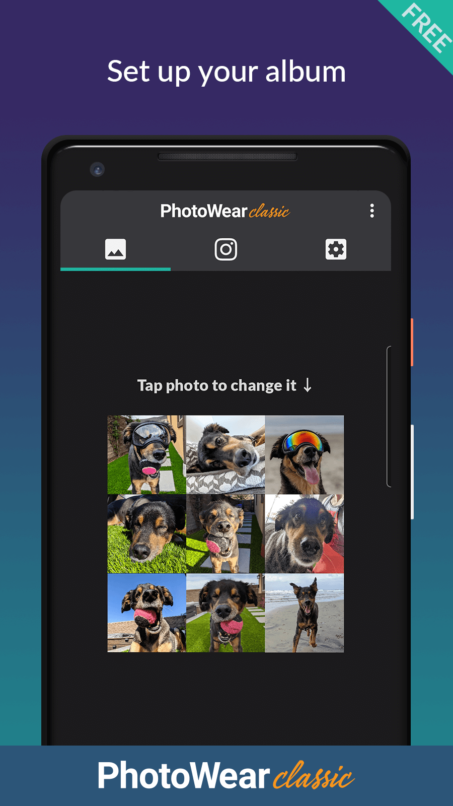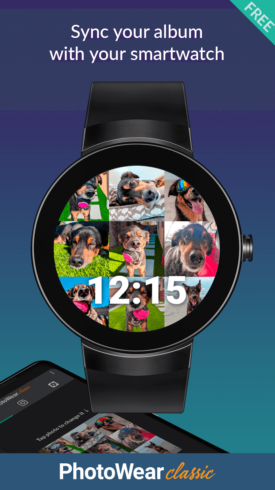 Photowear Classic Watch Face Premium t each photo is shown on the watch face in random order. Take pictures of your grandchildren or a recent trip you took and either share them with your friends or keep them all to yourself. Upgrade to PhotoWear Classic Pro for even more features, or use the free version until it expires. You can choose up to nine of your favorite photos from your phone’s gallery and then use the watch face to move between them quick
