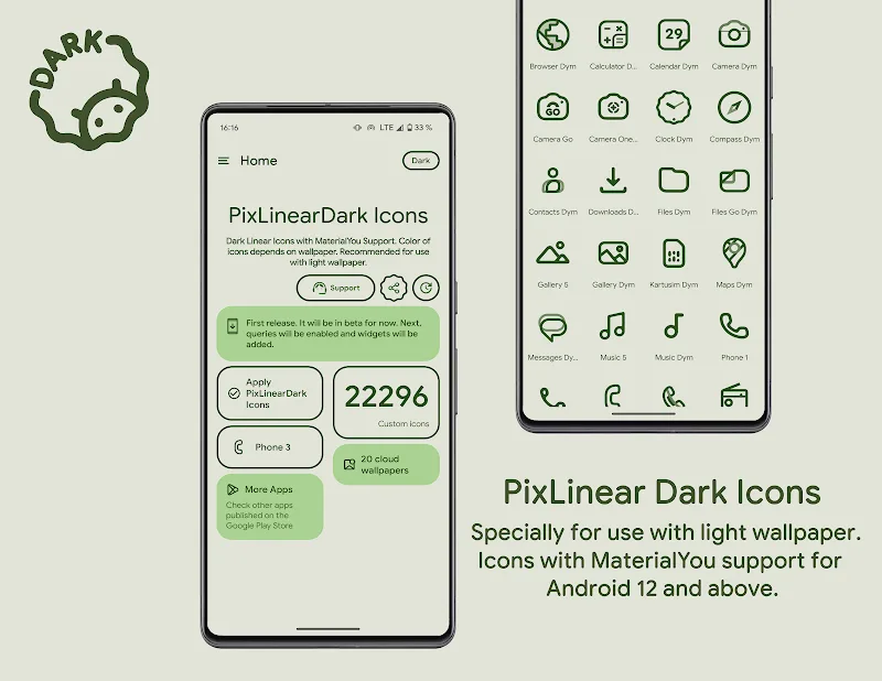 Pixlinear Dark Icon Pack Premium ause it is simple and sophisticated, it gives users an extremely pleasant feeling, increasing their concentration to a new level.Wallpaper Contrast Boost: And if you have applied this application to your smartphone, you will also have a great wallpaper treasure to create the best contrast for the icons.MATERIAL YOU INTEGRATIONThe most unique point of this application is its compatibility with wallpapers. There is a rather annoying thing when you use icon packs that are not compatible with wallpapers. The contrasting colors make the icons som