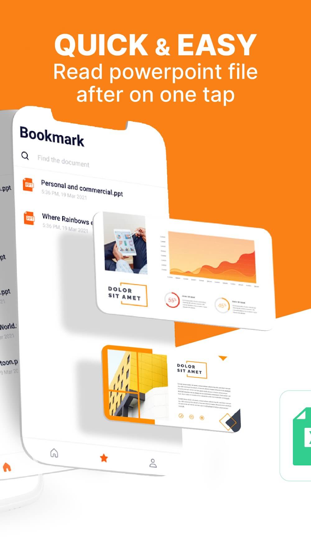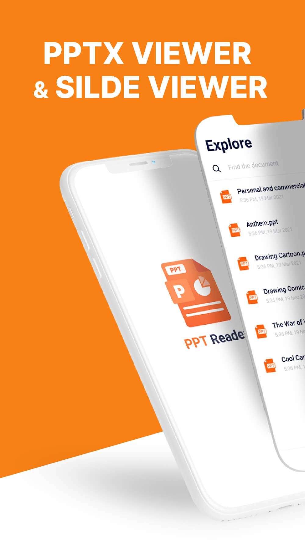 Ppt Reader Pptx File Viewer Premium ice files, including PowerPoint, ppt, pptx, docx, pdf, word, txt, and more. It ensures improved compatibility and allows you to view PPT files and slide presentations with ease.High-quality view of all slide file formats: PPT Reader provides a high-quality picture of all slide file formats, allowing you to view presentations in clear and crisp detail.Simple and elegant reader screen with essential controls: The app has a simple and elegant reader screen that allows you to read documents and slides easily. The essential controls make navigating the files easily and accessing different options.Ability to read and view different document file formats: PPT Reader is not just limited to PPT and PPTX files; it also supports reading other document file formats like DOC, DOCX, XLS, TXT, PDF, and more. This feature makes it a versatile and useful app for reading and viewing different types of documents.Fast file reading support: The app has quick file reading support, which means it loads and displays files quickly, making it easy to access and read documents on the go.E