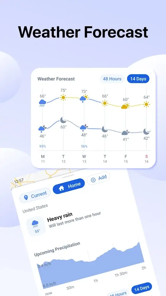 Rainviewer Weather Radar Map Premium ewing modes, and you can also change the viewing direction to suit you best. When you want to know exact information about rainfall and weather in a certain area, you need to click on that exact location. Or you can also type in the search button, and immediately, the information you need will be provided in the most complete way.Focus locally: If you want to see weather information for any area, you can zoom in on that area and rely on the annotation to see the appropriate parameters.Hyperlocal view: The area you live in will be displayed according to different weather types, the parameters will be the same but the expression is different and users can consider choosing.Adjustable radar: The application will show the amount of rain in different types and you can rely on satellites to see where the rain bands appear from.ACCURATE WEATHER FORECASTINGWeather information is provided quickly by the application and you have the right to choose from many different types of weather. Users can choose the forecast time period, and can forecast within a day, 3 days, or 1 week. Not only that, users can also see the 1-month weather forecast application, and th