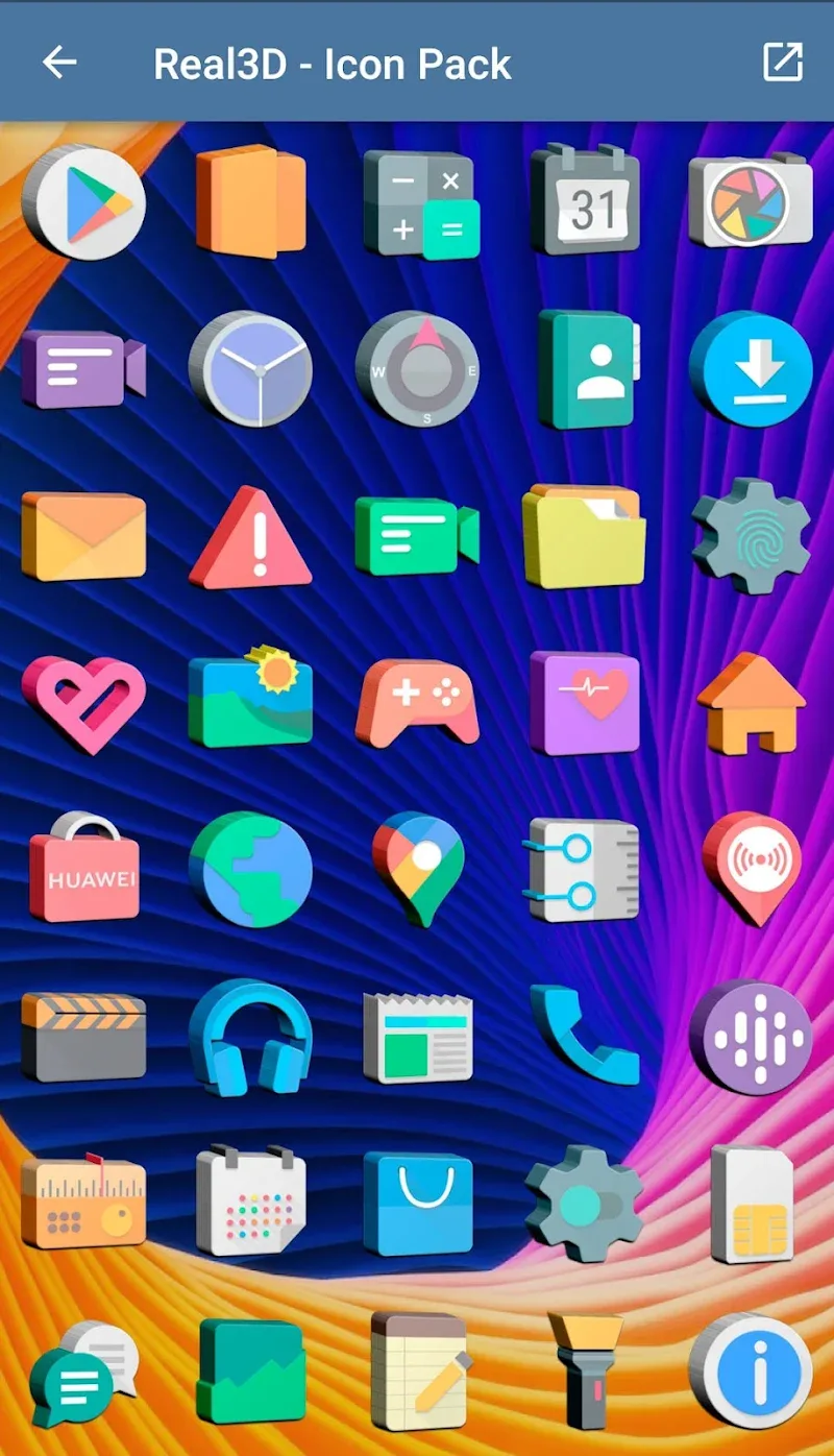 Real3d Icon Pack Mod Apk The icon pack contains 4800 available icon templates. Users can use all of these icon templates to redesign the interface. The application can apply this rich icon pack in bulk. Users can preview and admire this unique icon pack.Customized Folder Icons: Users will own an application that provides all the tools that can support the interface redesign process. The size of the icon pack will be customized according to the user’s requirements. However, their size is also limited to a certain range.Neatly Organized Categories: The icon library is divided into categories. Users can preview the icon templates in each category. Th