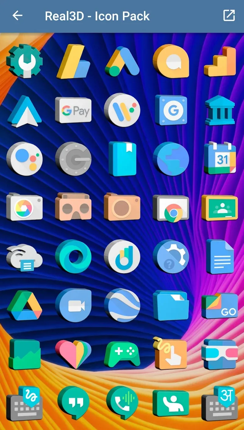 Real3d Icon Pack Premium e application provides icon templates with diverse shapes and soft pastel colors. The shadow effect will make this 3D icon pack more realistic.CONSISTENT SUPPORT & UPDATESThe application will continue to add missing icon templates to the icon library. Users can own a huge icon store with many unique 3D icon templates. They are also allowed to request the application to update missing icon templates. In addition, dynamic calendar templates are also shared by the application.Continuous Icon Growth: The icon pack will continuously update new icon templates. Users have more icon templates to design a new interface. The delicate