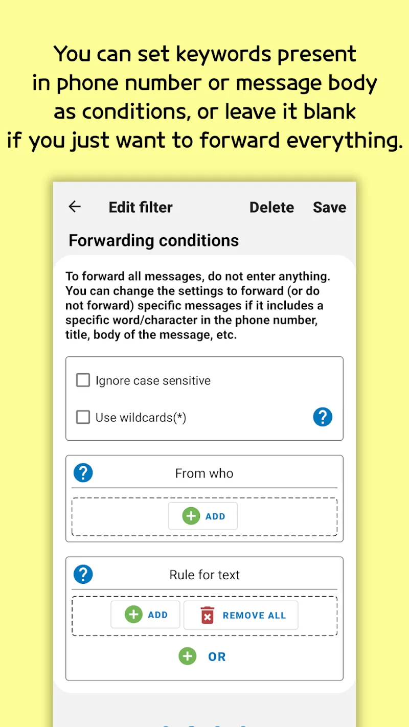 Sms Forwarder Premium n because this application will help you forward the message directly from one application to another.Customizable Options Cater: The application also provides many options for users to be able to forward their messages as they wish.Real-time Synchronization Ensures: This application will also synchronize all message data in real-time so that you don’t miss any important messages.ADD VARIOUS FILTERSTo increase the efficiency of message management, the application also supports users with a number of filters based on phone numbers, message content