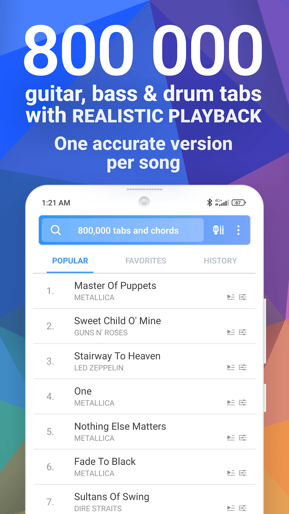 Songsterr Guitar Tabs & Chords is an application that brings you many interesting lessons through available guitar teaching videos. With a diverse and attractive music treasure trove along with many talented artists, you can learn guitar every day in your own way. If you are in need of self-learning to sing and play at home, try this application and explore the smart features it provides to learn more useful lessons, helping you improve your playing skills.HUGE CATALOG OF TABSIf you want to practice playing the piano and have a passion for music, this is a useful application that can meet all your requirements. Most people save money by learning the piano at home and working harder through online teaching videos. As long as you are excited and interested, this application will be the right choice for you. In addition, you will also be able to comfortably experience a vibrant music space.Over 800,000 guitar, bass, and drum tabs & chords: The application provides users with many chords of many different types of guitars, creating opportunities for users to learn online.Tabs for all your favorite songs and artists: Here, you will discover and meet many famous artists. Choose your favorite songs to create your own collec