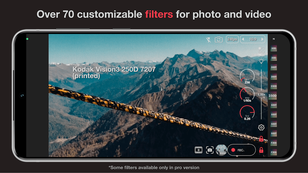 Super 16 16mm Film %d1%81amera Mod Apk es of modern features. The application has a set of modern filters, adding new special effects to make the filming process simpler. Not only that, you can set the shooting origin or change the filter flexibly during the filming process.Extensive Filter Library: The application provides you with a lot of impressive filters, and you can easily see 70 filters, including special profiles such as Kodak Vision3.Manual Color Control: Users have the right to choose different color options for their camera lenses and freely ed