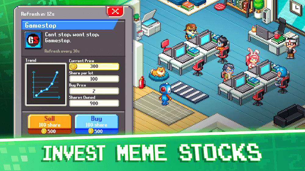 Tap Tap Trillionaire 8 Bits Mod Apk sing their business profits.BUILD A TEAM OF TRADERSOne of the game’s attractive features is the ability to build a team of traders. Players can recruit characters with different skills, from negotiation to marketing. Combining the team properly will help players achieve highly profitable transactions. However, managing and upgrading the team requires players to invest time and effort.Diverse trader roster: The business with players will take place in the form of buying stocks at low prices and reselling them at high pric