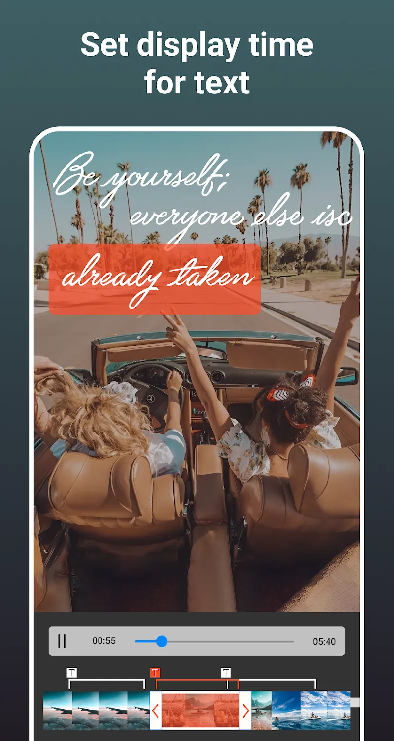 Text On Video Premium ckground color to text color, making the video more vivid and attractive to viewers.Easy Text Manipulation: Basically, you will still be given the right to edit the font size as well as other things related to it. In addition, you can edit the appearance time of the characters, which becomes a unique feature of the app.SEAMLESS AUDIO INTEGRATIONWith this feature, you can create product introduction videos, promotional videos, birthday greeting videos… in a more vivid and impressive way. Synchronizing text and audio