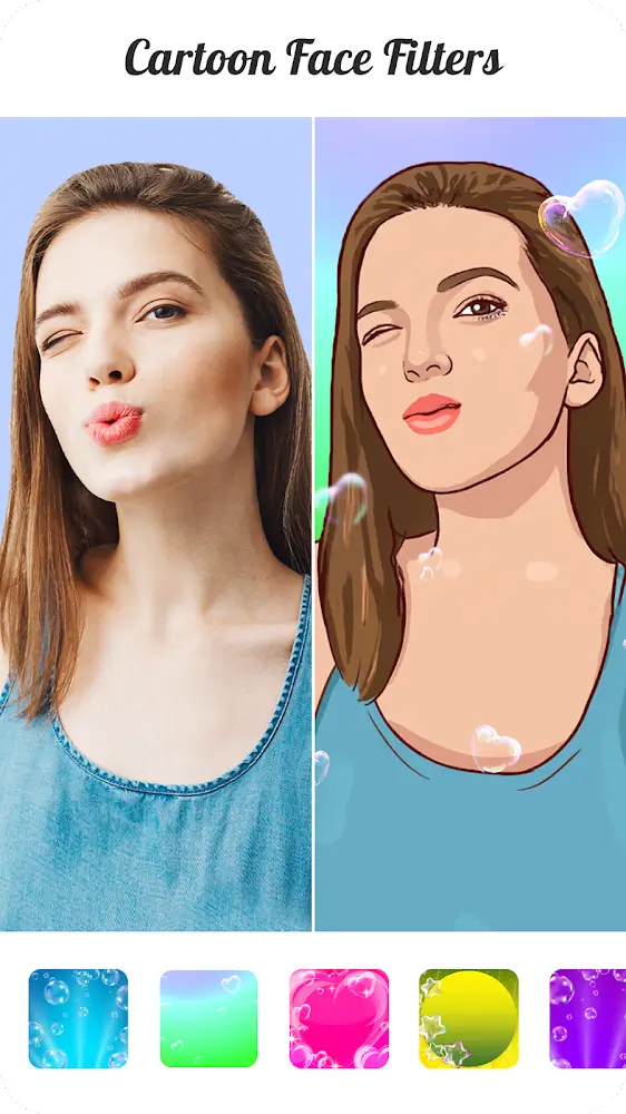 Toonapp 2 Mod Apk rrent trends: Just touch the filter, and you can immediately enter the Big Head event.Update new things: The application will always refresh its resources to satisfy any user.CARTOON PHOTO EDITORThe point to note when using ToonApp is that there are many filters with different characteristics that you will need to choose from. This selection does not cause difficulties for users, but it does take a lot of time because their number is completely diverse. Therefore, you should also be patient when using them, and of course, the result of choosing is absolutely sweet when you have made the perfect choice for you. In addition, this also brings joy to each person because they will be able to satisfy their curiosity while using the application, so this is definitely an experience that you cannot miss. Not only is it used to create beautiful photos, but filters also play an extremely effective entertainment role.Simple selection: From your images, the app can transform any of them into an animated version.Many unique elements: Filter possesses many different features that you cannot ignore.REMARKABLE BACKGROUNDS AND FUN LAYOUTSAnother interesting point when users u