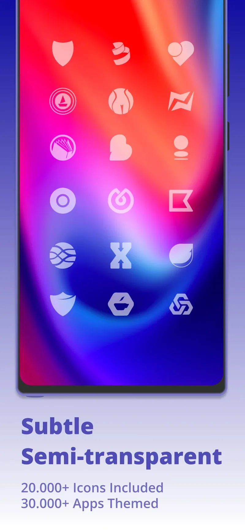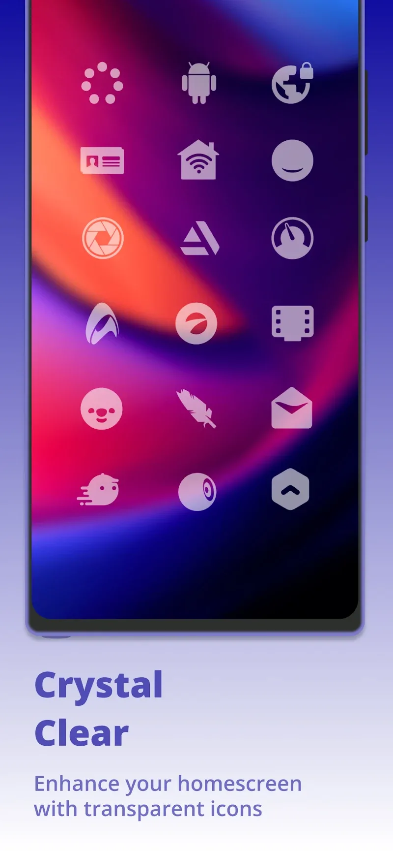 Transparency Icon Pack Mod Apk esigns. With these modern designs, your phone will be covered with a completely new and much more interesting interface.Seamless Blending: These icons have extremely unique designs with a semi-transparent interface. With these icons, your phone will become much more interesting and stylish when using them to decorate your phone.Enhanced Visibility: These icons will increase the visibility on your phone without making the interface dull or ugly. You will own an extremel
